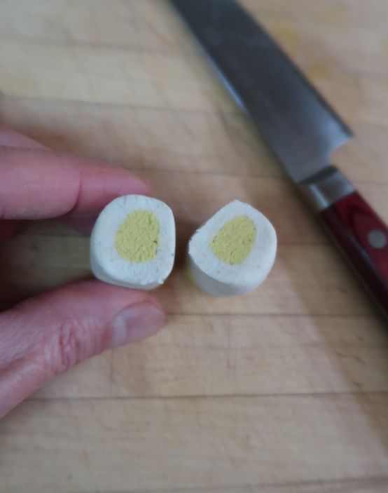 Make a hot dog, shape it into a log and cut for dumpling wrappers. Encase a ball of one color in one of another color.