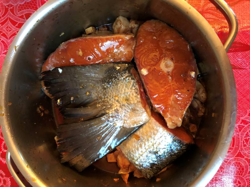 - Taste the sauce and adjust the flavor with a pinch of sugar to remove any harsh edges, or a sprinkling of fish sauce for more savory depth. Carefully transfer the fish to a shallow bowl. Don't worry if the steaks break up a bit. Surround the fish with the pork pieces, pour the sauce over the fish and pork, and serve. To eat, put a piece of the fish on your rice and spoon on a bit of sauce.
