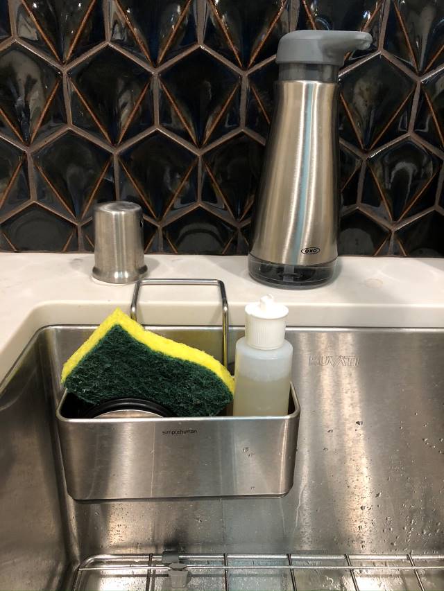 Someone zoomed in on my Simple Human kitchen sink caddy when I posted a photo of the kitchen on Instagram. The caddy is fantastically low-key and functional. There are holes in the bottom that allow airflow and moisture to drain so that the sponge isn't gross or sitting in a puddle of water. The suction cups actually work - they stick to the stainless steel sink.