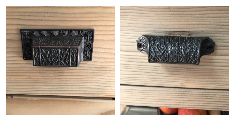 Vintage Millwerks included the drawer pulls and casters in their quote. So I sent leftover drawer pulls from other custom cabinets in our house. The bin pulls (below), a closeout from Restoration Hardware, have an arts and crafts charm; there were 3 of one kind and 2 of another. Given that, I had the 2 bigger ones installed on one side and the 3 smaller pulls on the other. Then, I shopped for special casters (see below).