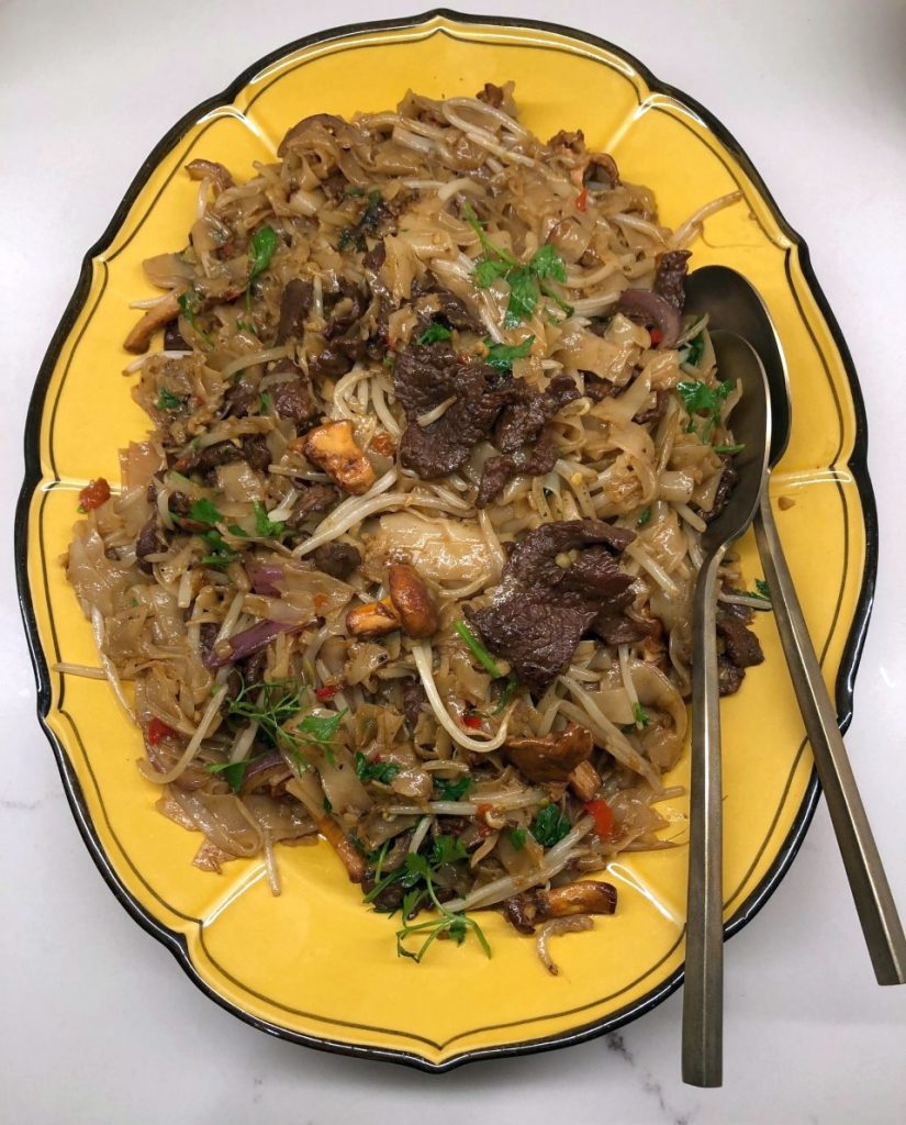 Here's a beef chow fun recipe for you to work off of. I swapped the fermented bean sauce with 1 ½ teaspoons of chile garlic sauce. And, I threw in a handful of mushroom with the beef. When done, I scattered freshly chopped dill and flat-leaf parsley on top.