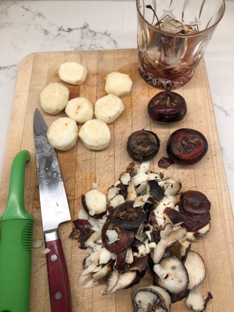 All you have to do is trim the ends, then use a knife or better yet, a vegetable peeler to go around the water chestnut to remove the remaining skin. A cocktail helps move things along, too.