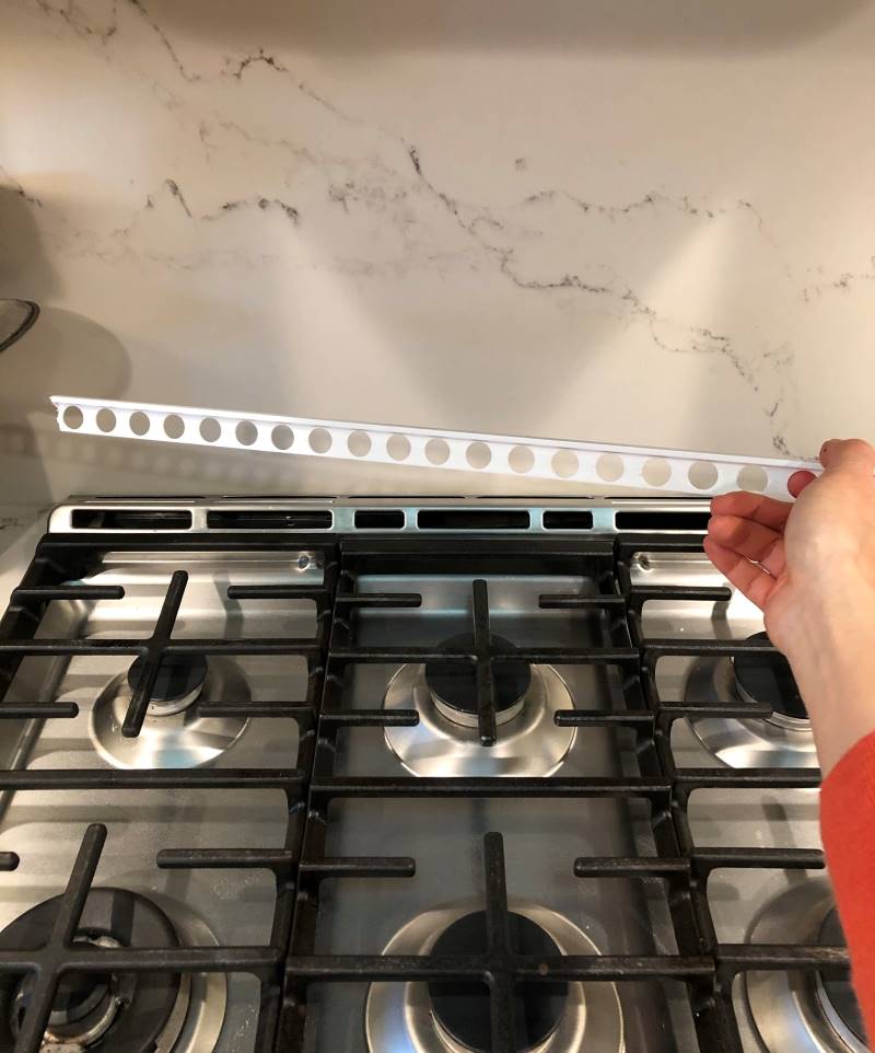Around November, I went to Home Depot and looked around the tile area to find a PVC version of Schulter that sold for less than $8. (Matte white metal Shluter was going to cost about $45 after shipping because it was a special order.) Then I took a hacksaw to the tile edge trim and cut it to the width of the stove. There hasn't been a problem since. The plastic did not melt when I heated the oven up to 550F for pizza! And it comes out easily to wipe and clean.