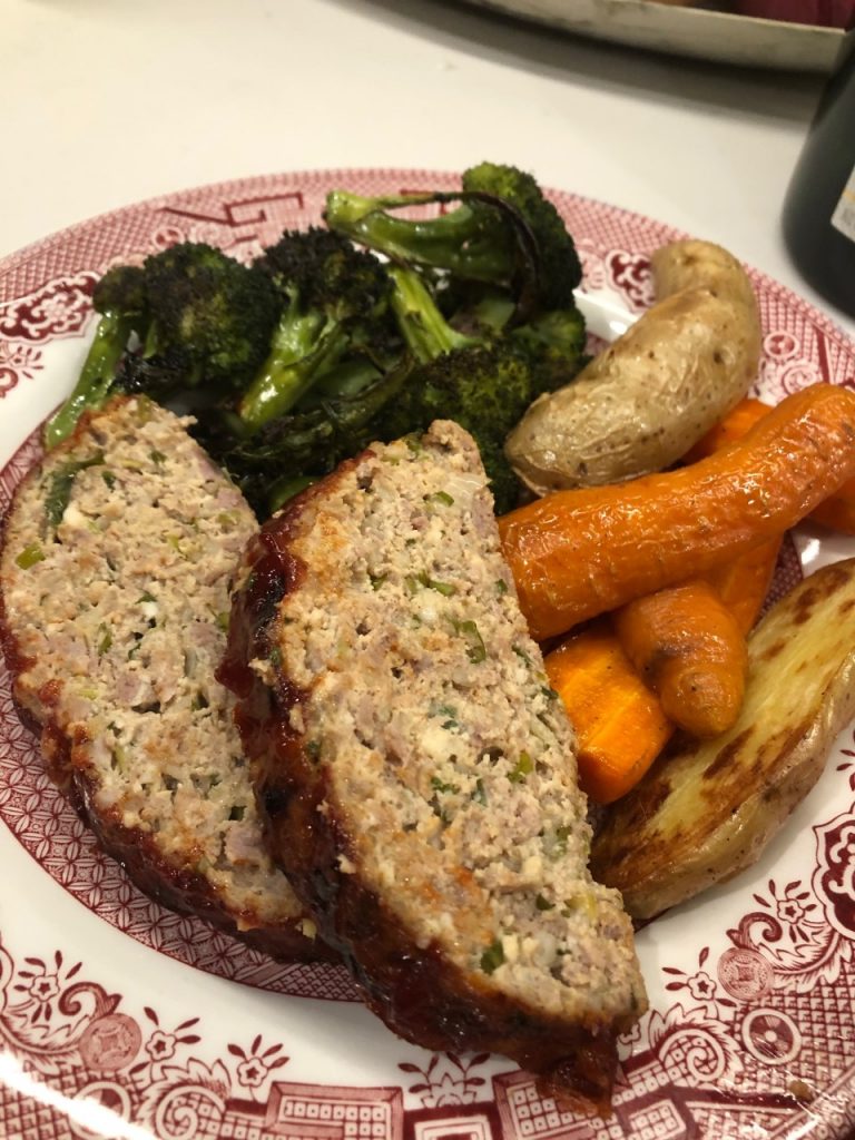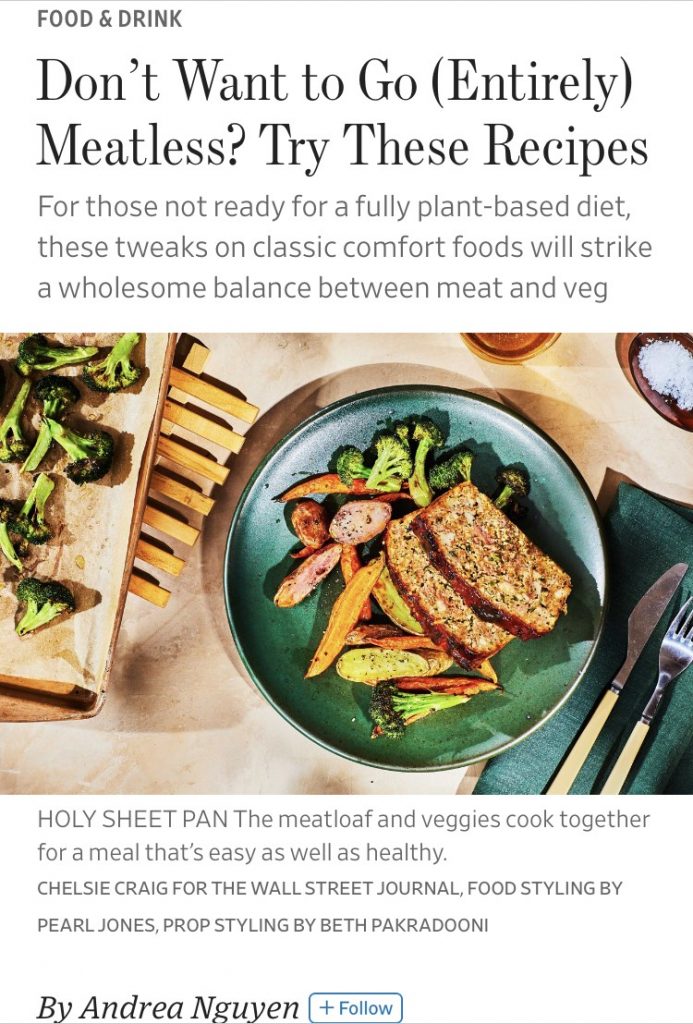 The result was a moist and tender tofu meatloaf sheet pan dinner, with leftovers to last for a week. I loved experimenting with texture and seasonings. I gifted extras to unknowing neighbors, who lauded the meatloaf's texture. Here's an unfancy reference shot for the meatloaf meal recipe published at WSJ.