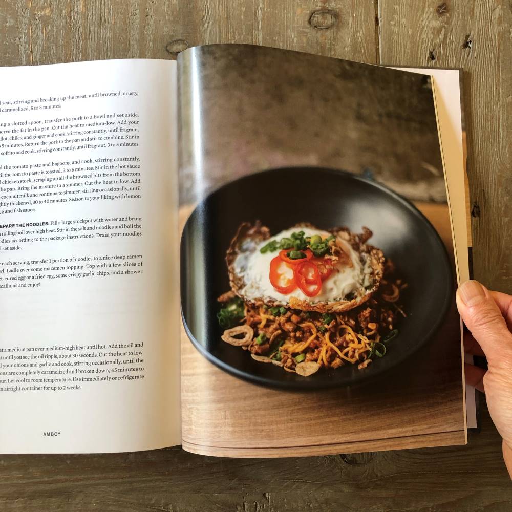 Through his food and in his book, Cailan demonstrates his Filipino creativity many times over. For example, Amboy offers up cheeseburger lumpia on page 98, pulled pork adobo on page 218, and a lentil twist on oxtail kare kare stew on page 316. He takes on banh mi, Croque Madame, and Japanese noodle dishes. He puts his Filipino-American imprint on mazemen, a preparation akin to a brothless ramen (second photo below).