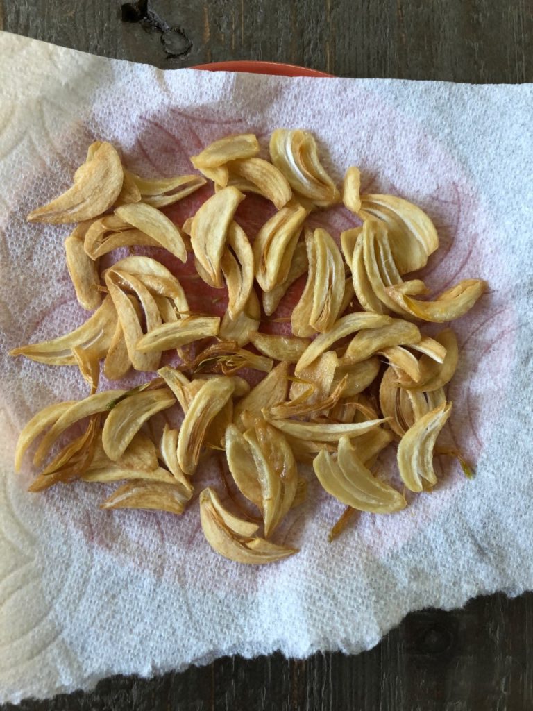 - Meanwhile, make the crispy garlic chips. Put the garlic in a small saucepan and pour enough oil in to cover. Heat over medium-low until gently sizzling. Let fry for several minutes, until pale golden. They won't be crisp. At this point, pick up the pan and swirl it to continue cooking the garlic but slowing things down so you may monitor progress. When a shade darker, pour through a mesh strainer set over a small bowl. Allow the garlic to rest a few minutes then spread out on a paper towel to finish cooling and crisping.