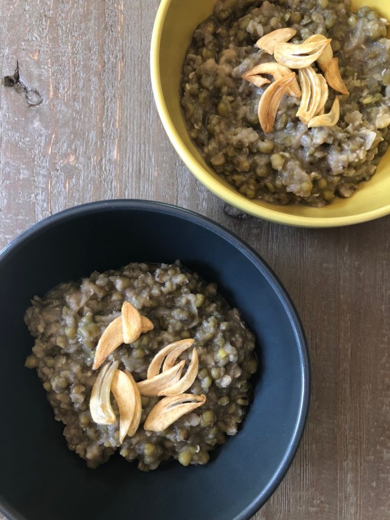 - When the munggo is done, there should be about half the amount of visible liquid. (If the mung beans are too firm and you don't have liquid in the pan, add water and continue simmering.) To finish the flavor, stir in the liquid aminos. Taste and add more or season with extra salt. Ladle into shallow bowls and garnish with garlic chips. Serve immediately.
