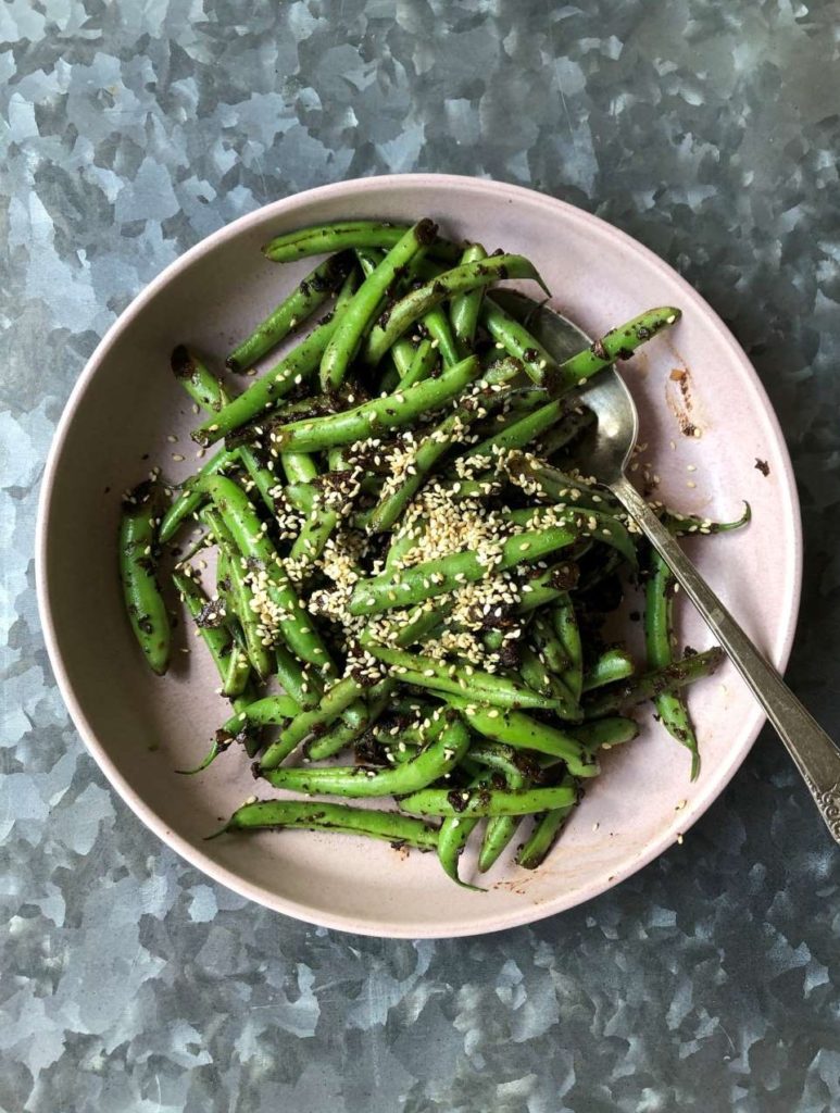 - Make a 2 to 3-inch hole in the center, then add the remaining ½ tablespoon of oil. Dump in the black bean sauce and let it sizzle for about 10 seconds, then swiftly stir-fry to distribute among the green beans. Splash in the water and continue stirring, moving the beans in the pan constantly for 1 to 2 minutes longer, until the water is no longer visible and the beans are tender-crisp and coated with bits of dark black bean goodness. Drizzle in the sesame oil, stir to combine and turn off the heat. Taste and if needed, add extra salt. Sprinkle on the black pepper for pungent oomph, if you like. Transfer to a serving dish and garnish with the sesame seeds. Serve immediately.