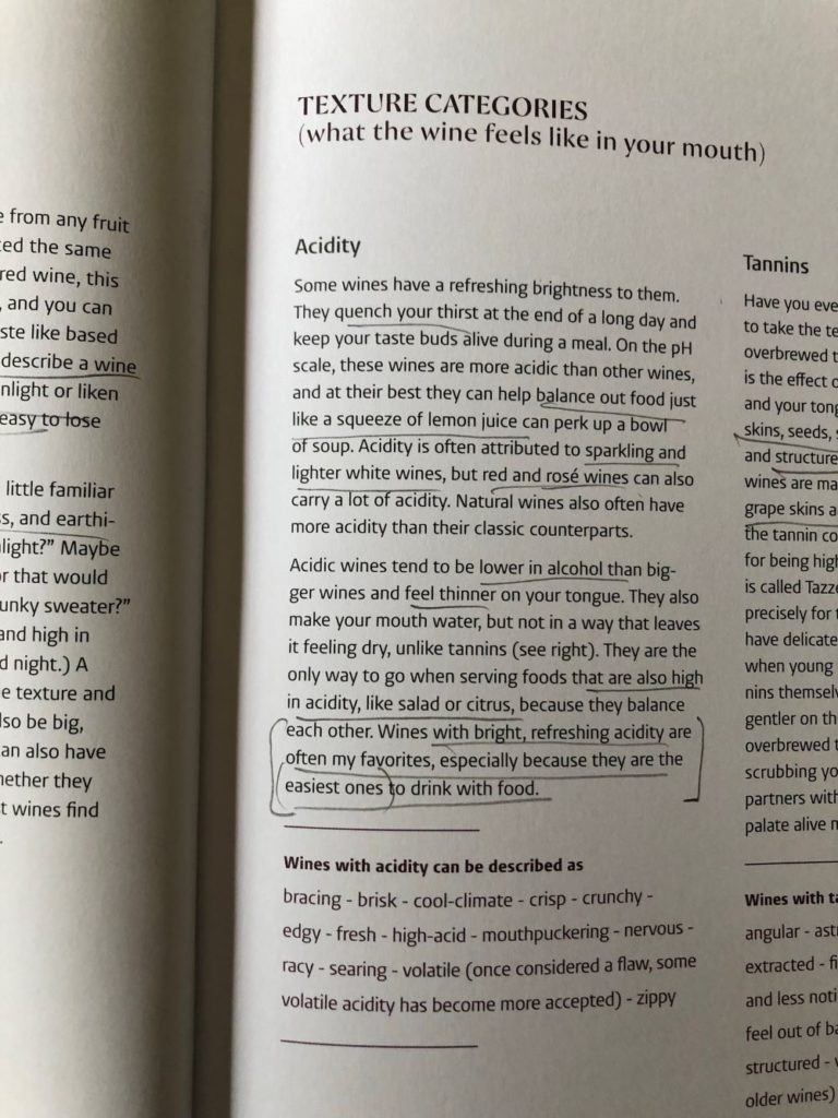 For example, Kate offers succinct, humorous advice on how to understand wine textures and flavors. Wine pros often talk at length about acidity, tannins, body, fruitiness, earthiness, minerality, and herbal/floral notes. For sophomore-and-junior-level drinkers like me, I really want a concise explanation. Something that I can apply and keep learning from.