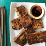 Daikon cakes are awkwardly called turnip cakes but it's daikon (a kind of radish) that is commonly used. The snack is called lo bak go in Cantonese, luó bo gāo in Mandarin, and bánh củ cải in Vietnamese. The cake is thrice cooked -- a relatively stiff batter is first made in a pot, then it's steamed in a mold or pan, and after chilling, it is sliced and pan-fried. It keeps for days in the fridge, ready to be cut and fried. It is fantastic make-ahead food.