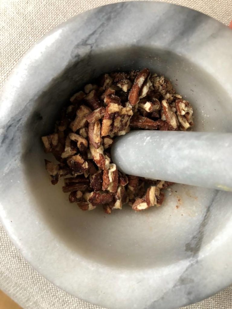 The go-to nut for Asian dishes like this one would be peanuts or walnuts. I used pecans because they have a delicate buttery sweetness. Given that people bake pies for the holidays and may have some around, I realized that the seasonal stars had lined up for me to go with pecans.
