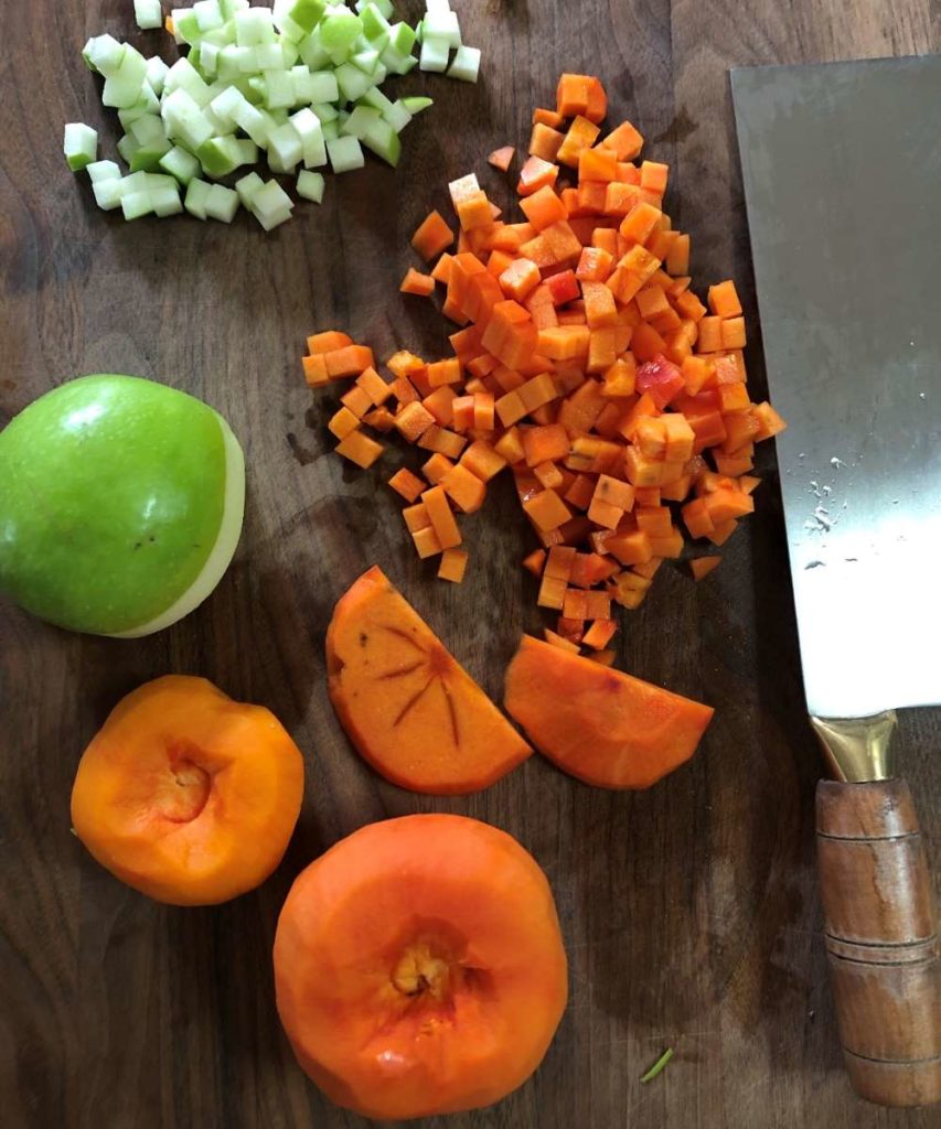 Persimmon is fruity sweet and I wanted textural and flavor contrasts. A tart, crisp apple counters the persimmon perfectly. I chose Granny Smith but there are many other kinds out there. It's apple season.