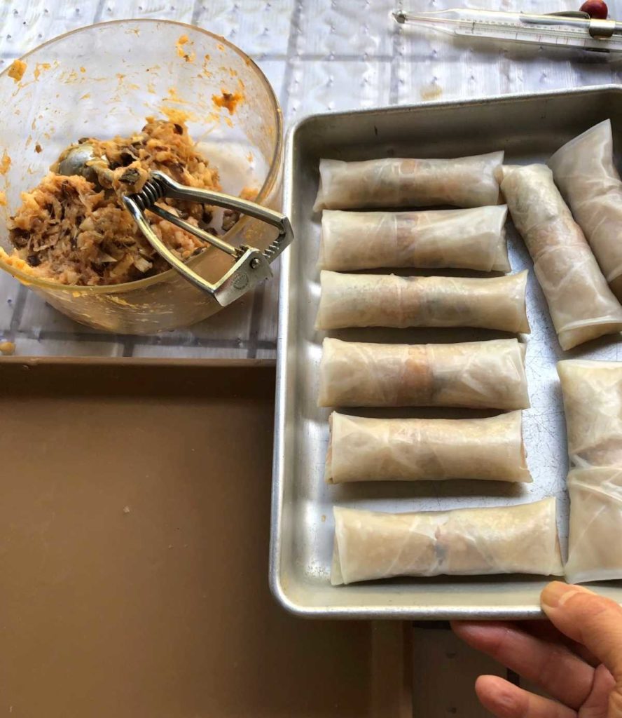 Because the filling is raw, it will be naturally wet and a bit messy to deal with. My mom uses an ice cream scoop to portion and place the filling. Then we use finger tips to neaten and shape the filling into a log.