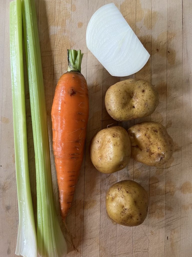 - In a 3 to 4-quart pot over medium-low heat, melt 1 ½ tablespoons of the butter. Let cook for a minute or so, until fragrant and dark blonde. (If using oil, heat it over medium heat until barely rippling.) Add the onion and cook for 2 to 4 minutes, until soft and aromatic. Add the potato, carrot, celery, and ¾ teaspoon fine sea salt. Give things good stir, then add water to cover by 1 inch (or enough water for some of the veggies to float).