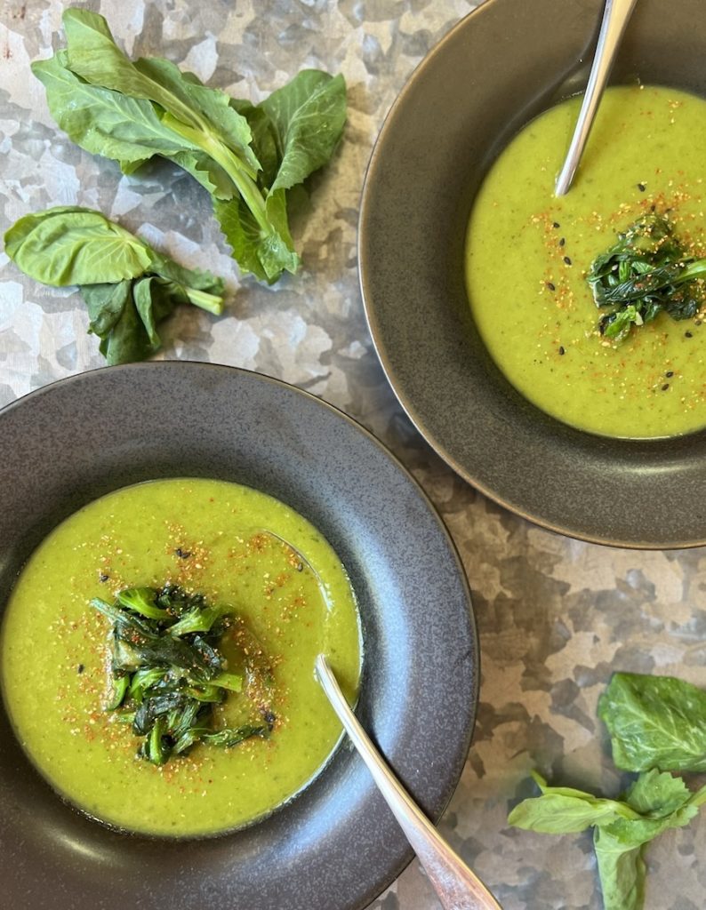 In the past, I've followed convention and stir fried the pea tips with broth and garlic, as I did in this recipe. My husband and I can gobble up a plate of pea tips that would otherwise serve four average diners, so the precious vegetable would disappear fast in our house and on our table. Pea tips are pricey ($4 to $7 per pound) so I wanted a new recipe to capture the pea tip flavor and stretch it, too. This soup was the answer. It's a recipe that evolved over days as we ate up the contents of the pot and I kept tweaking things. I ended up doubling down on the pea tips. The resulting recipe is a fabulous and elegant option for enjoying an Asian leafy green.