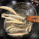 - Pour oil into a wok to a depth of ½ inch. Set over medium heat. (If you want, protect the floor near the stove with newspaper.) When the oil is around 350F (test with a dry chopstick and the oil should immediately bubble around the chopstick), add as many fish as possible without crowding. Stir gently and turn the fish, as needed. When golden and crisp, 1 to 2 minutes, use a spider to lift the fish from the oil. Hold the spider over the wok for a few seconds to allow oil to drip back, then deposit the fish onto a paper towel to drain.