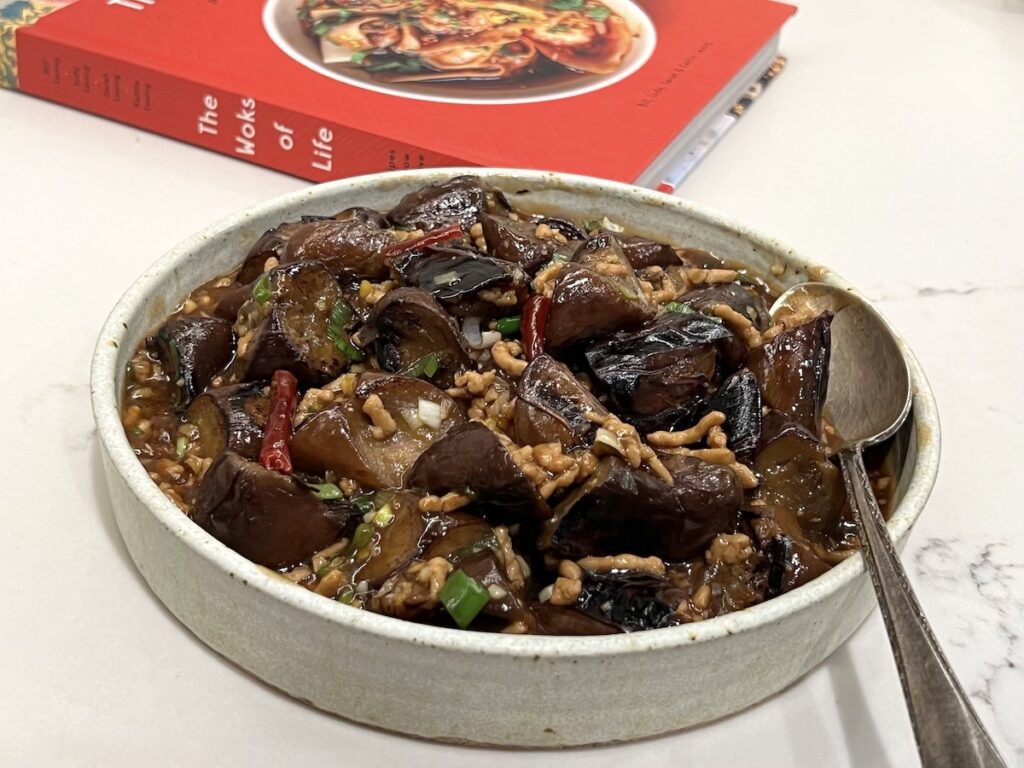 What's often presented at Chinese restaurants as eggplant in garlic sauce tends to be rather heavy from deep frying and one-dimensional tasting from a lavish use of chile garlic sauce. Good versions employ Sichuan chile garlic sauce for punchy, earthy fermented chile bean sauce (doubanjiang) or pickled chiles, black vinegar, soy sauce and a touch of sugar. It's more complex tasting than what's prepared at many restaurants. There are many renditions and I recently tried out a smart recipe by Bill, Judy, Sarah and Kaitlin Leung in their best-selling cookbook, The Woks of Life. The Leung family uses oyster sauce and other basic Chinese pantry items to achieve their yu xiang flavor. Instead of pickled or fermented chile bean sauce, they deploy dried chiles. Additionally, they sear and pan-fry the eggplant in lieu of flash frying the eggplant in lots of oil -- the traditional method for yu xiang qiezi.
