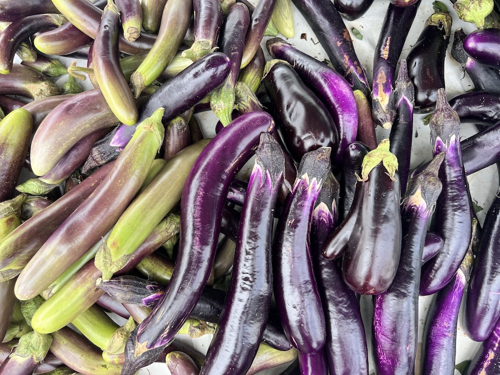 Chinese eggplants are my first choice but the purplish Filipino ones would be great too. Both have thin-ish skin. Japanese eggplants have thicker skin so I would avoid them here. An Italian eggplant would work too. Below are eggplants grown by a Hmong farmer. The selection is pretty typical in California at farmer's markets. Asian markets mostly have Chinese and Japanese eggplants. Occasionally, there are Filipino eggplants too.