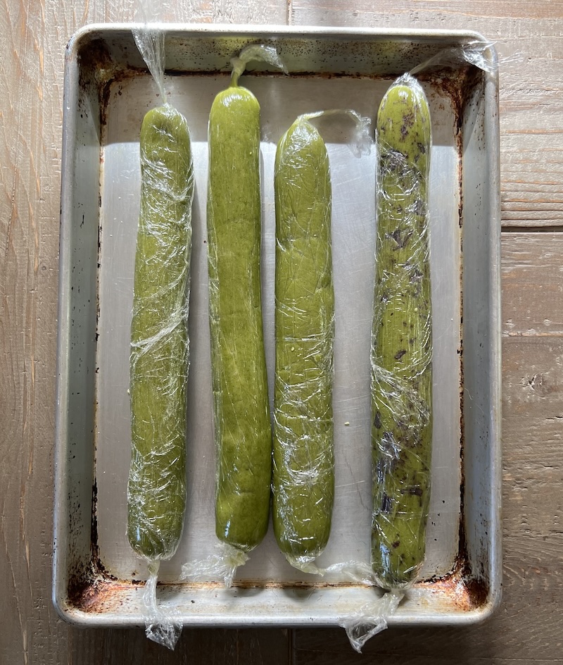 - Repeat with the remaining 3 portions of dough. Place the dough logs on a baking sheet and refrigerate for at least 2 hours until completely chilled and firm, or freeze in a resealable freezer bag for up to 3 months, and place in the refrigerator 1 hour before baking.