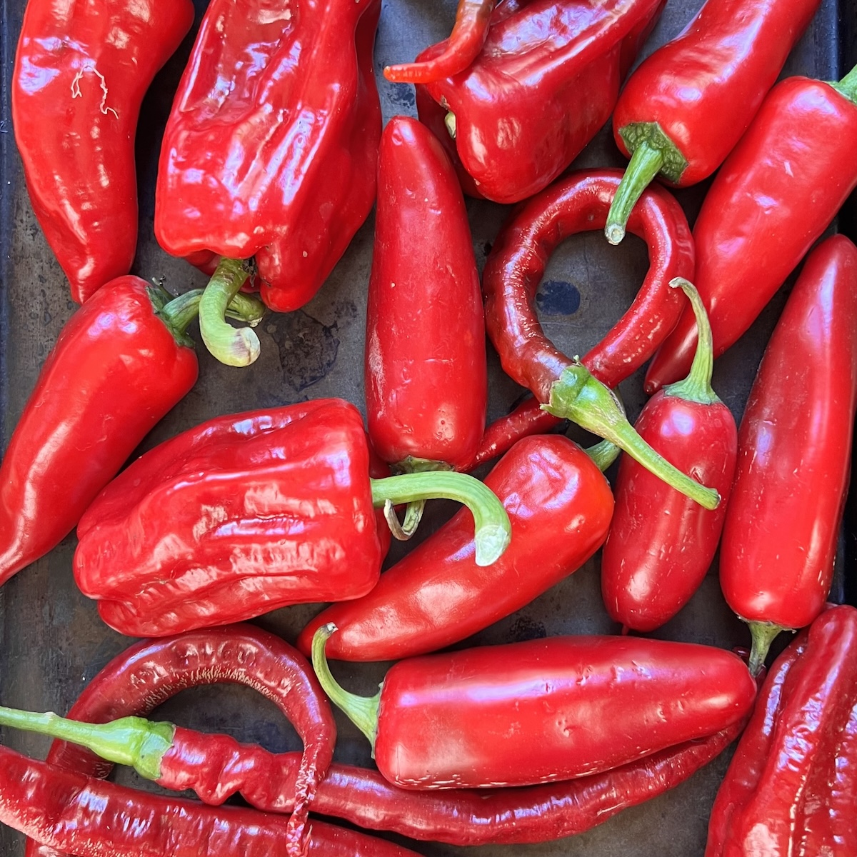 Below are ripe red jalapeño, Fresno, Aleppo and cayenne. I used them in equal proportions in a big batch. The result was fruit and moderate in heat -- enough for my niece to say, "I don't like hot sauce but I like this one!" Chiles ripen in late summer into late autumn so look around. Of course, shop at Asian and Latin markets and others for a wealth of flavors to choose from.