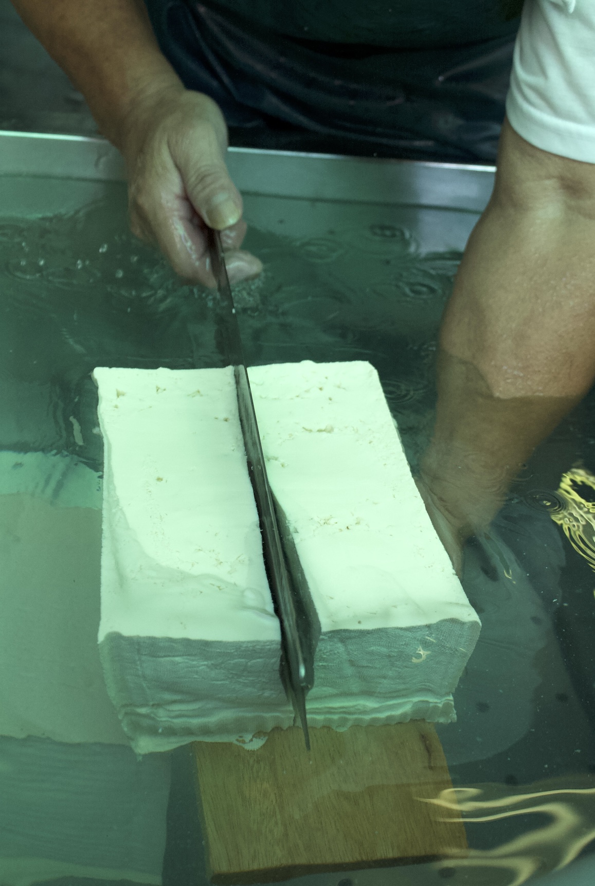 There are many ways to make tofu. When hot soy milk is coagulated with a salt or acid, soy curds separate from clear liquid whey. The curds are transferred to and pressed in molds to make block tofu. My Asian Tofu cookbook field research led me to Tokyo where I visited a neighborhood tofu shop, the source of this photo: