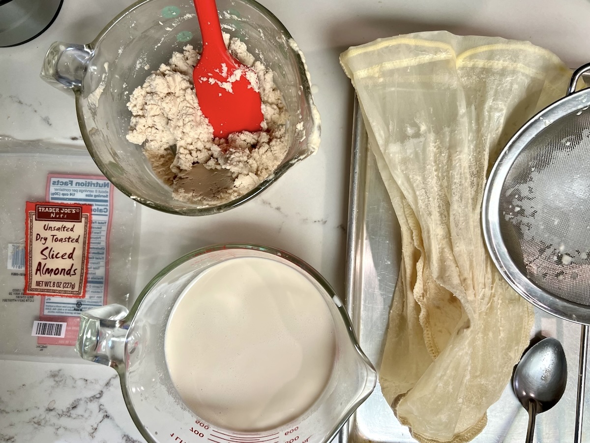What is a nut milk bag? It's a super fine mesh bag used for making nut milks. I've used it for fresh soy milk too. It's very handy and easy to clean. Mine (below by the mesh strainer) is relatively big so I can put lots in and squeeze well. It has served me well for years.