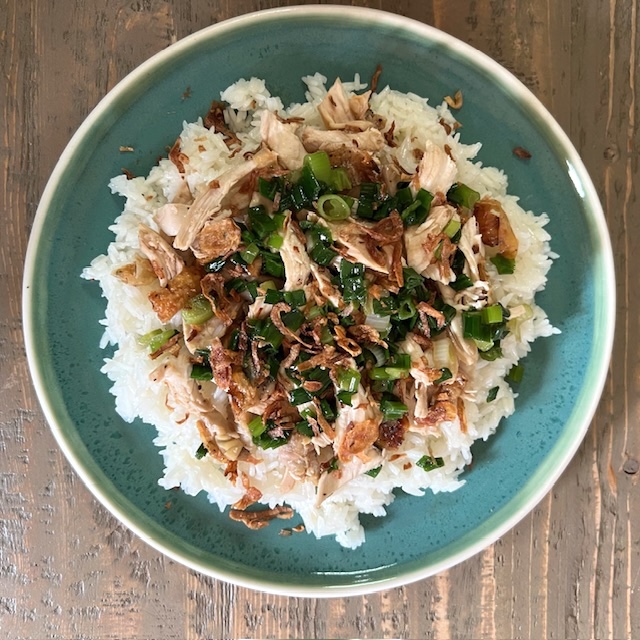 Here in America, where chicken was more affordable than in Vietnam, my family regularly ate Maggi-inflected gà rô ti for dinner. Leftovers found their way into banh mi sandwiches and became a topping for this sticky rice garnished with scallion oil and once in a while, fried shallots.