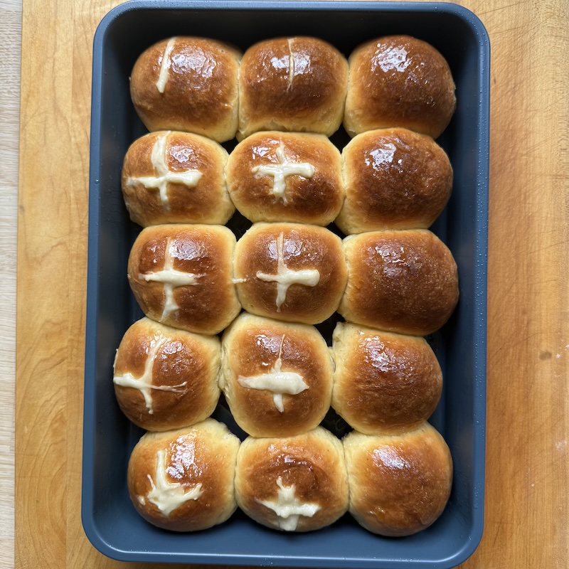Cross paste and other additions: I made these as fun Hot Cross Buns for the Easter season. They're lofty rolls with the signature cross so I could use them for sliders or rolls at a meal. If you want to put candied citrus peel or raisins and spices into the dough, try it out and let me know how it works.