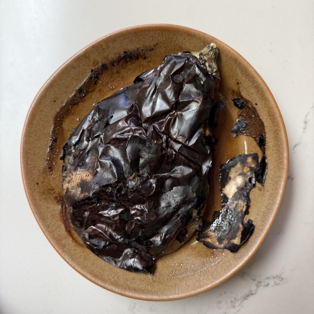 - Char the eggplant to smoky sweetness: Use high heat on your biggest burner on a gas stove, perforated grill pan (see note below), or outdoor grill. Char the eggplant, rotating often until blackened here and there and smoky but not fully softened, about 10 minutes. (Turn on your exhaust if cooking indoor.) Transfer to a microwave safe plate. Slide into the microwave, cover with a splatter guard (see note below), then microwave on high power until softened and deflated, 8 to 10 minutes.