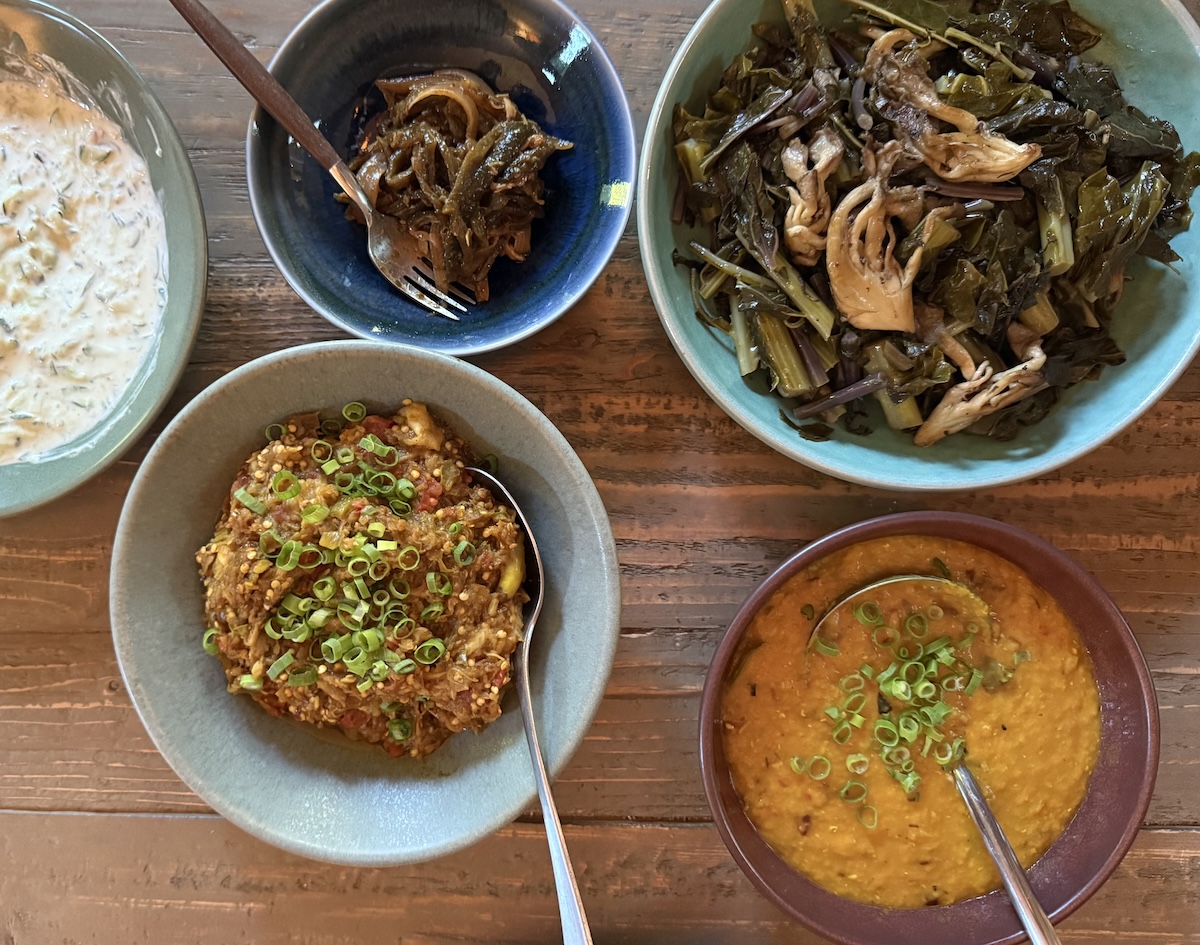 Gujarati-style charred eggplant is very compatible with grilled fare, whether it's animal or vegetable. I included it with a mini feast of grilled lamb steak in a spicy herb marinade and Thai grilled turmeric chicken. For a vegetarian meal, I paired the eggplant with a simple dal of red lentils, cucumber raita, roasted poblano peppers, and greens with seared mushroom. Bhatt's I Am From Here includes many other gems like his green tomato pie.