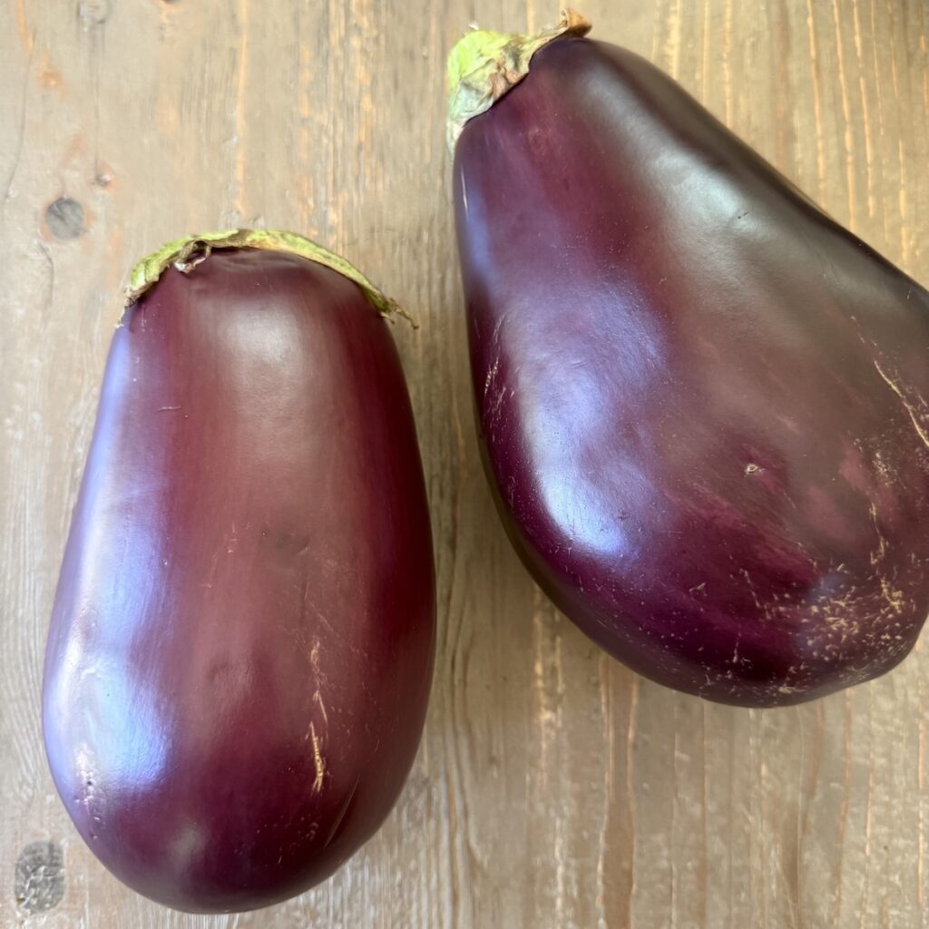 Choose a heavy, firm-yet-slightly soft eggplant. I use globe eggplants. It should feel very weighty in your hand but give a little like a well-filled balloon. A rock hard, taught eggplant tends to lack sweet flavor. Store the eggplant at room temperature if using within 2 days. Refrigerate in loosely closed produce bag in the vegetable crisper drawer to keep for a good week.