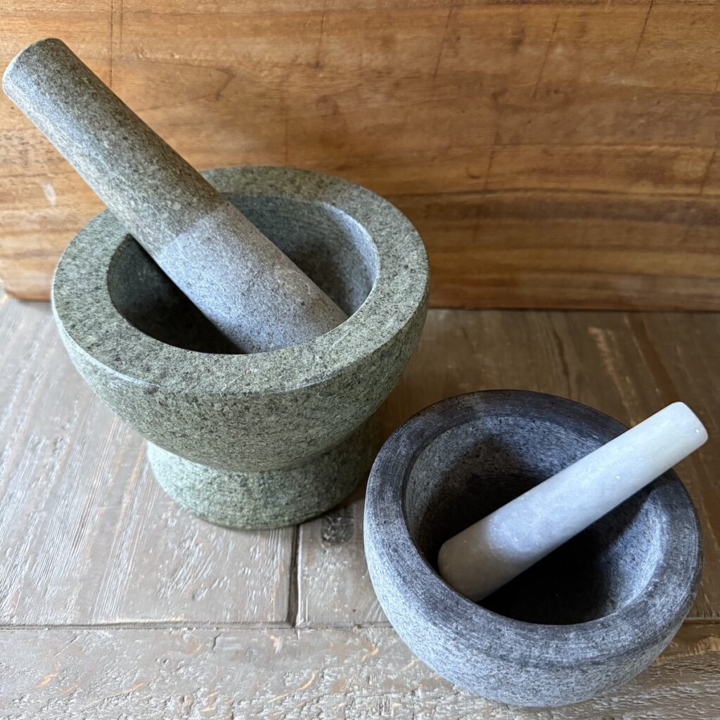 I own marble, ceramic, wooden, and stone mortars and pestles. The two below are the ones I used most often because they are not too small, are not too heavy, and they do the job well for spices, marinades, guacamole, and even pesto!