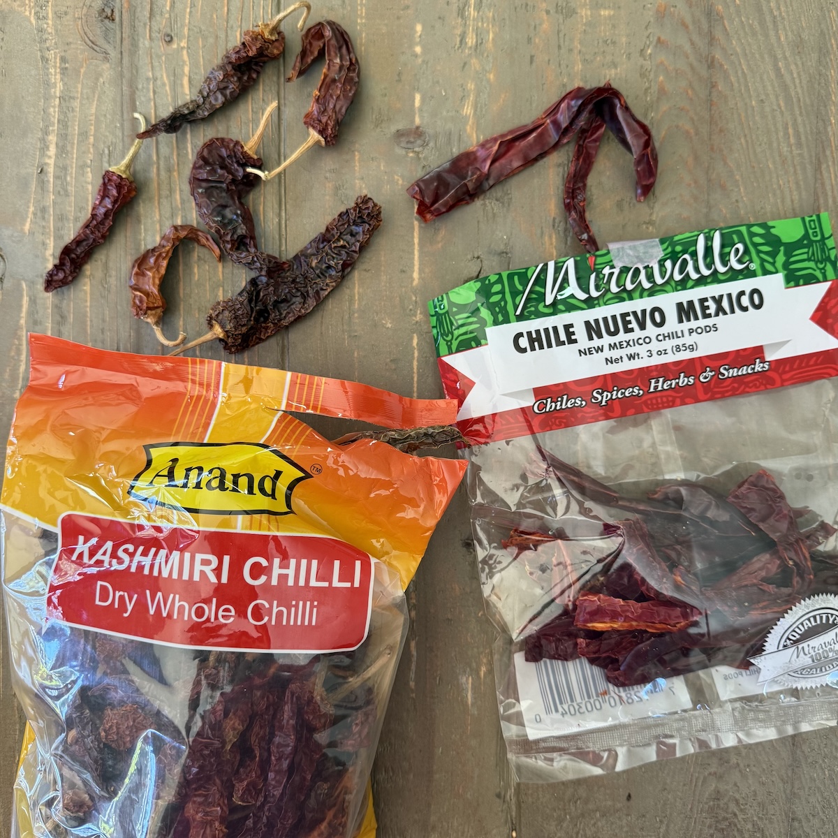 - 3 g | 1 ½ tablespoon seeded dried Kashmiri or New Mexico Chilies, snipped no bigger than ½ inch (1.25 cm)