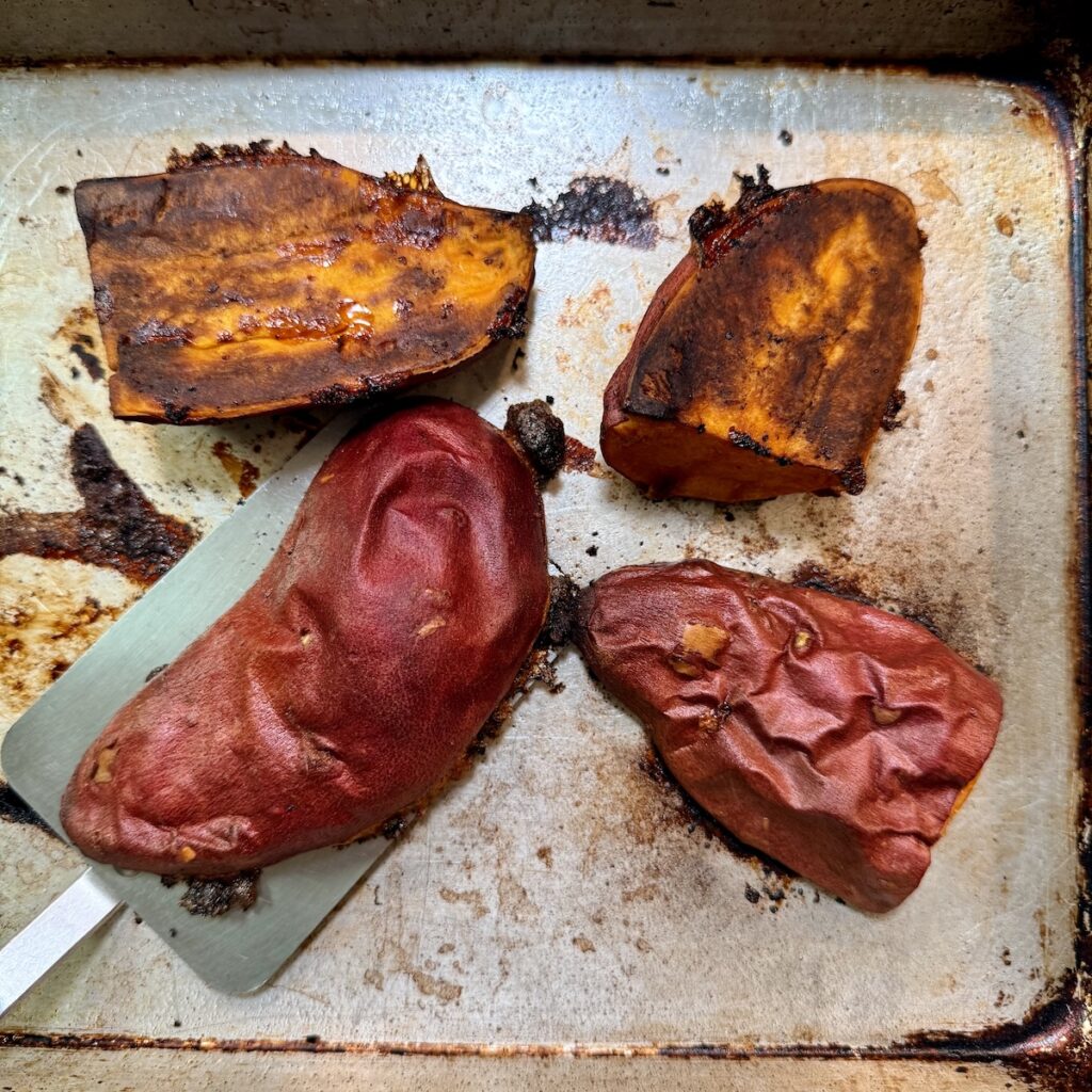 - To roast sweet potato: Preheat the oven to 400F (205C) with rack in the center. Rub a little oil all over the cut sweet potato pieces then place cut side down on a parchment paper -ined baking sheet (or not, if you want to scrub). Bake for 35 to 50 minutes, until soft (a metal cake tester or toothpick inserted should meet no resistance). Remove from the oven and let cool completely.