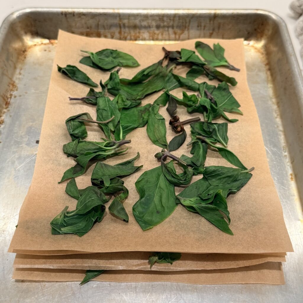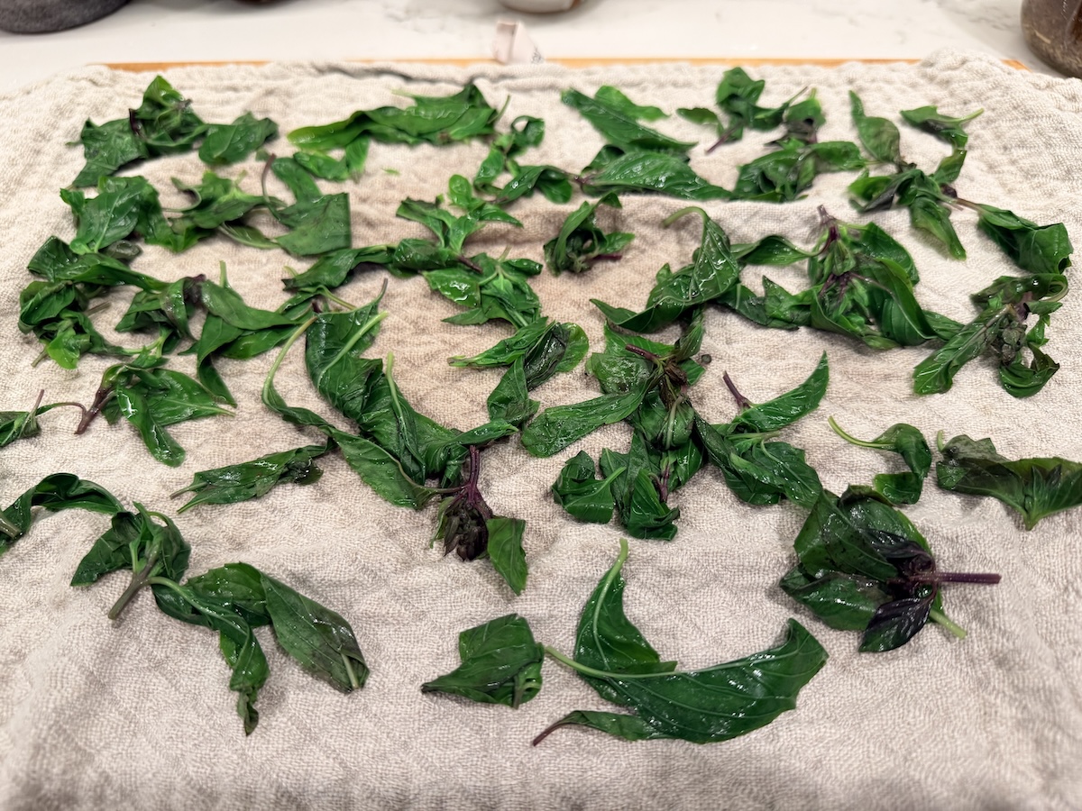 Arrange the leaves on a clean dry dishtowel more or less as a layer. Use another dishtowel to blot or pat away excess moisture. (Or, roll the dishtowel up to remove excess moisture then unroll.) Let air dry for 30 minutes or so, to dry a little more.