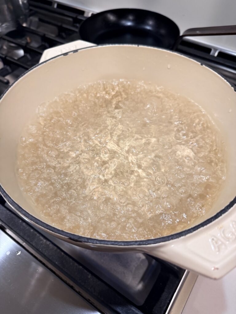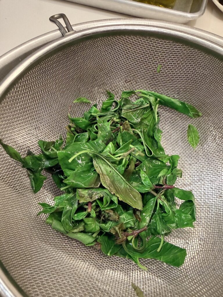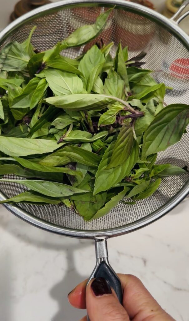 Prep and set up: Wash the sprigs then pinch off the leaves and tips. Select a wide pot or deep skillet plus a wide mesh strainer for blanching the basil. Test the mesh strainer's ability to sink deeply into the pot. You want to very quickly submerge the leaves in very hot water and then pull them out. Practice the dunk or else you'll fumble like I did my first time out! and I over blanched my leaves. When satisfied, add water to the pot and set it over high heat to bring it to a boil.