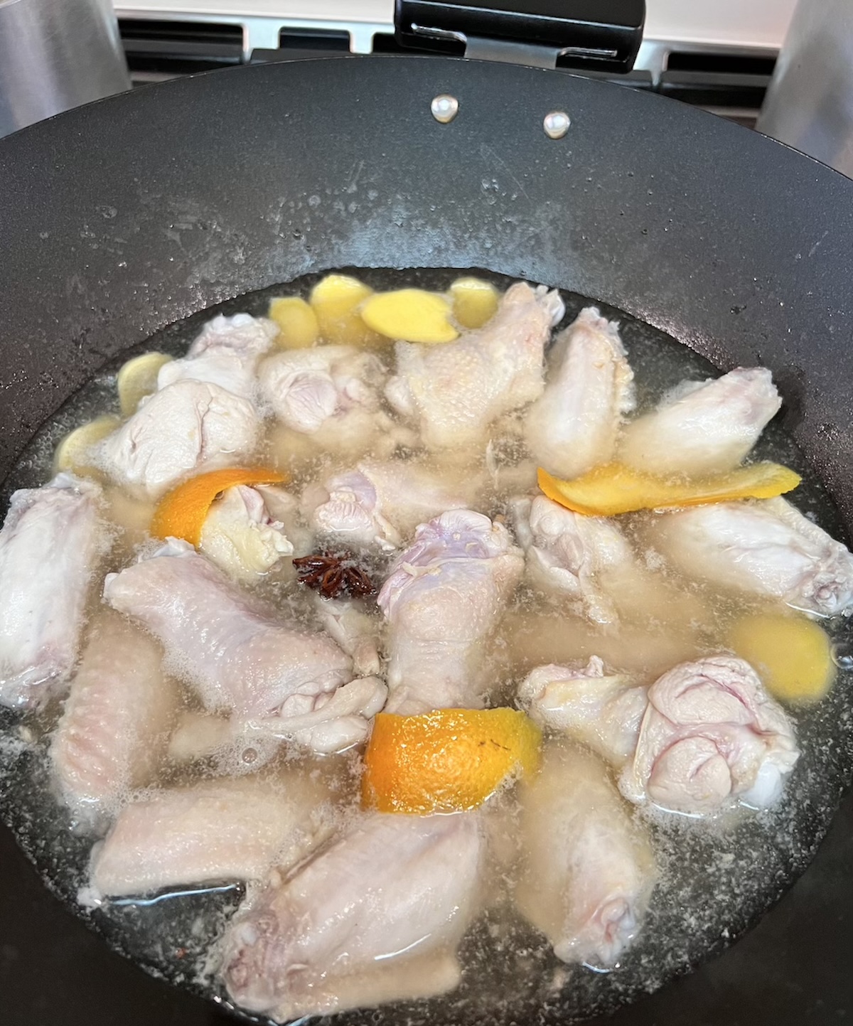 - Perfume the wings with wine: Because this first move is fast, set the chicken, wine, and hot water near the stove. Put the orange peel, ginger, chile, and star anise in a small bowl.